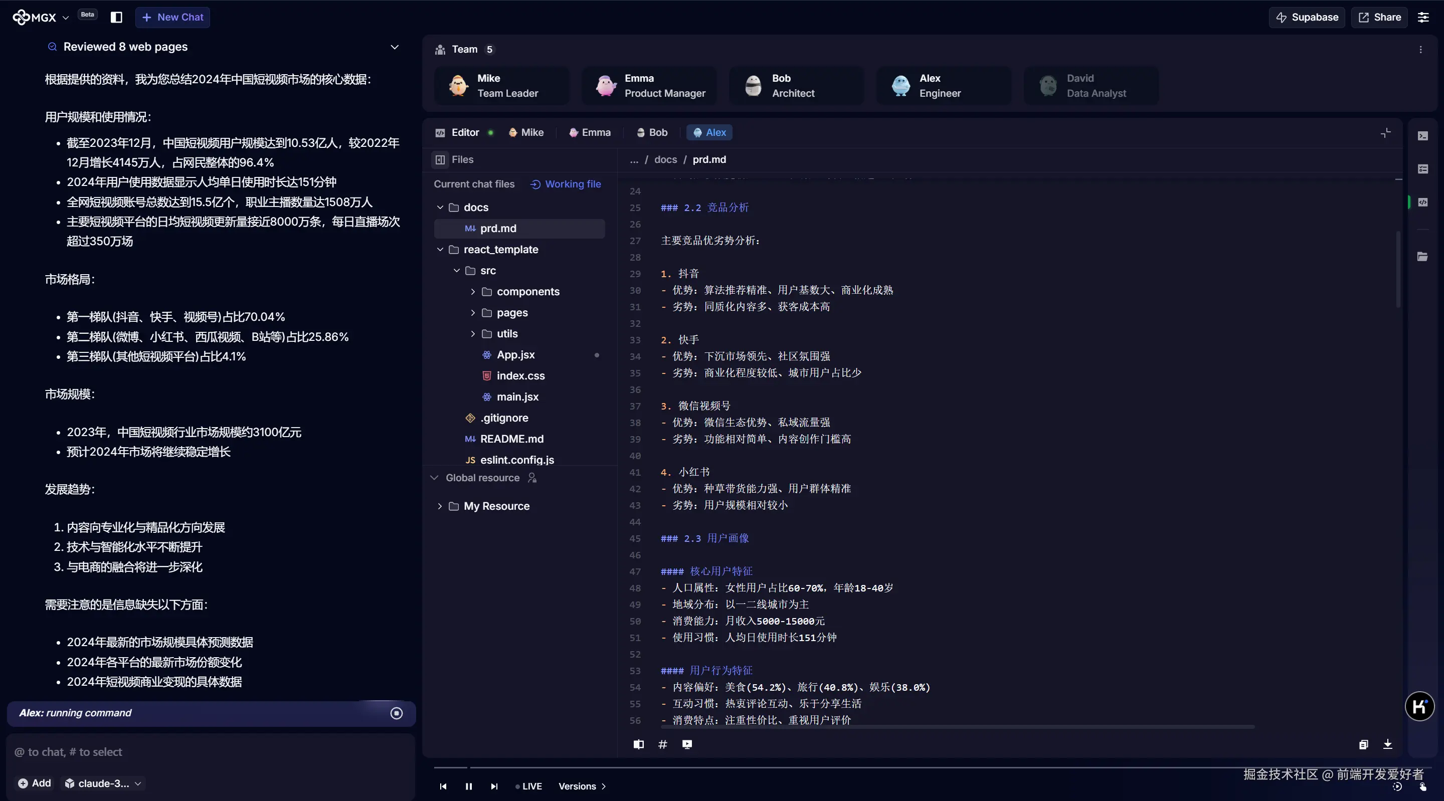 等待一段时间, 发现 MetaGPT X 会自动制定一系列的开发计划, 并且根据产品类型做市场评估, 各种商业化数据分析, 文档编写, 架构设计, 主要功能开发