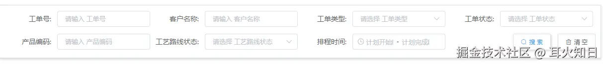 支持按工单号、客户名称、工单类型、工单状态、产品编码、工艺路线状态、排程时间等字段进行搜索。