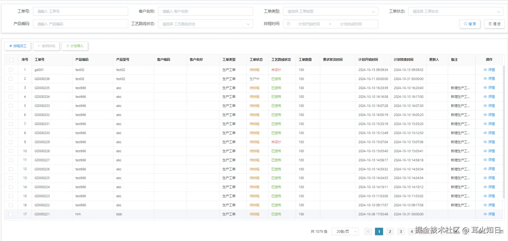 包含数据筛选框(工单号、客户名称、工单类型、工单状态、产品编码、工艺路线状态、排程时间)。