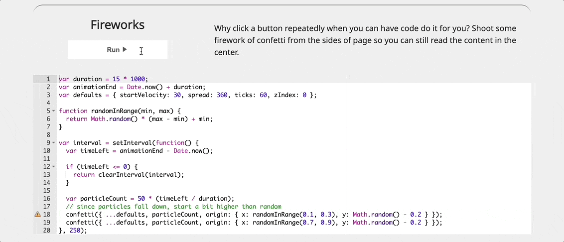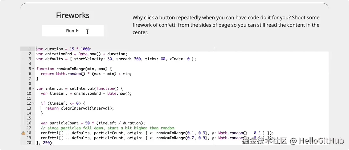 16、canvas-confetti:五彩纸屑动画效果的 JavaScript 库。这是一个轻量级、高性能的五彩纸屑动画库,让你轻松地在网页中添加炫酷的动态特效。它基于 HTML5 Canvas 技术实现动画渲染,支持粒子数量、发射角度、速度、重力、颜色等多种参数,以及自定义形状和文本动画,适用于节日庆祝、游戏奖励效果等场景。
