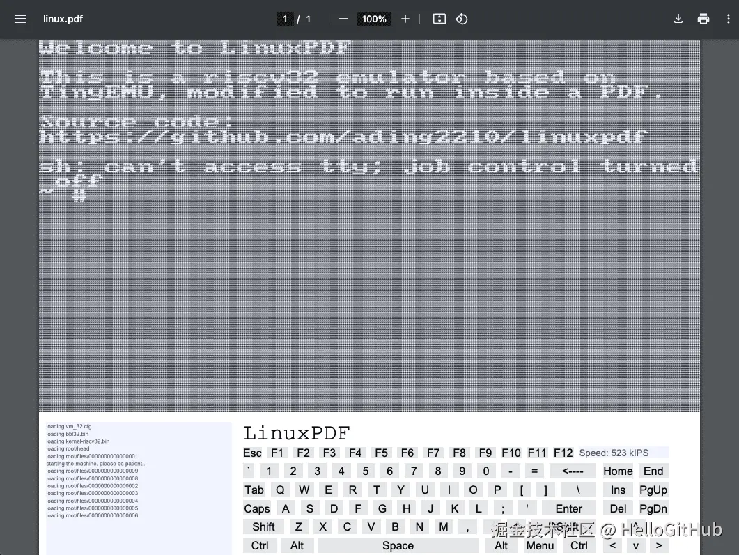 40、linuxpdf:运行在 PDF 文件里的 Linux 系统。该项目基于 RISC-V 模拟器 TinyEMU 将 Linux 系统嵌入到一个 PDF 文件中运行。用户可以在浏览器中打开这个 PDF 文件,启动 Linux 系统进行交互。