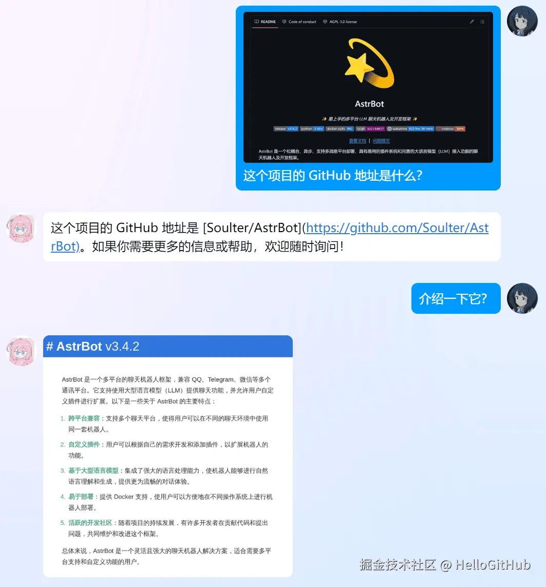 33、AstrBot:易上手的多平台 LLM 聊天机器人。该项目是基于 Python 构建的 LLM 聊天机器人及开发框架,支持集成多种消息平台和大语言模型。它提供了可视化管理面板和灵活的插件扩展机制,支持速率限制、白名单、关键词过滤、图片理解和语音转文字等功能。来自 @大痴小乙zt2kV 的分享