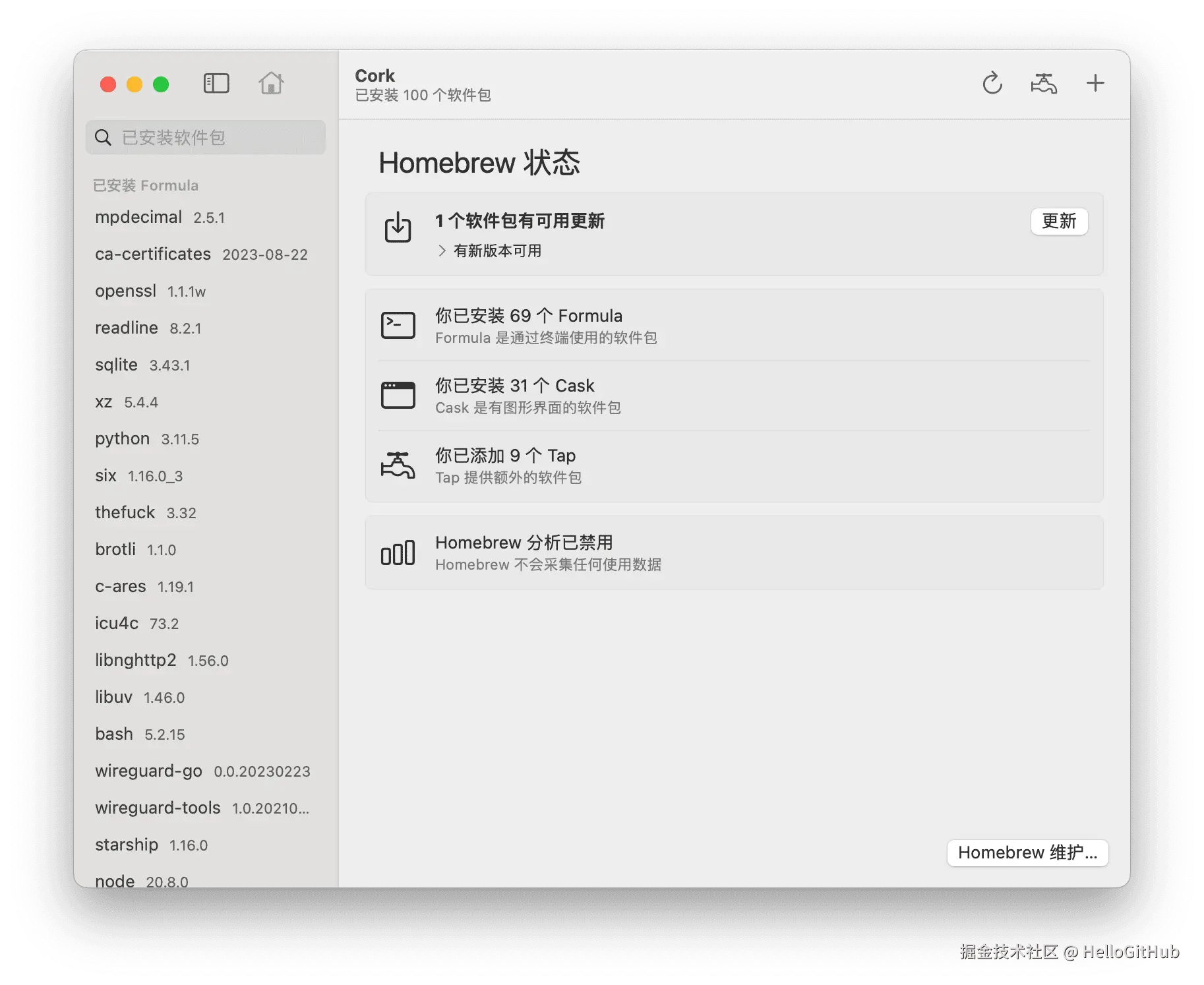 30、Cork:Homebrew 图形界面管理工具。该项是专为 Homebrew 设计的图形用户界面(GUI),旨在通过图形界面简化 Homebrew 的使用,让用户更轻松地安装、更新和卸载软件包。来自 @Micro·J 的分享