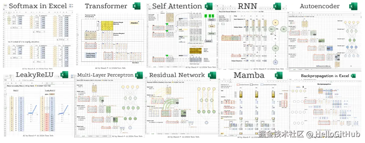 32、ai-by-hand-excel:用 Excel 手搓各种 AI 算法和模型。该项目是通过 Excel 的形式实现并演示人工智能与深度学习的核心算法和概念,让初学者可以动手操作并理解 AI 的运行原理,包括矩阵乘法、MLP、RNN、Transformer、ResNet 等,以独特且浅显易懂的形式,降低了 AI 学习的门槛。