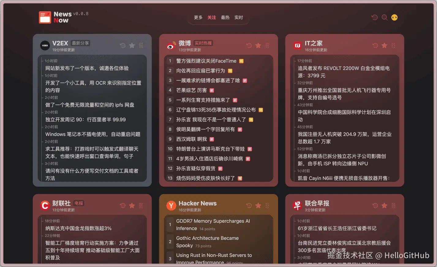 18、newsnow:全开源的实时资讯平台。这是一款高颜值的实时新闻与热榜网站,相比传统热榜产品更加注重实时新闻。它前后端完全开源、部署简单,可轻松托管到 Cloudflare Pages 或 Vercel 等平台。来自 @Ou 的分享