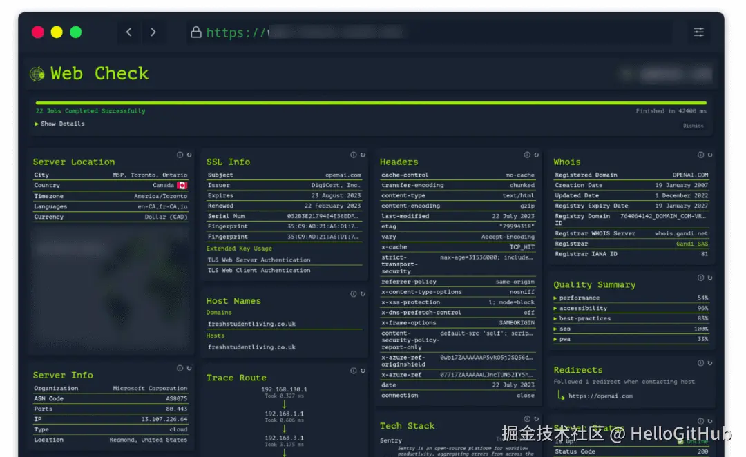 20、web-check:全面的网站检查工具。这是一款网站检查工具,可以显示指定网站更多的信息。比如:DNS 记录、服务器位置、站点性能、SSL 证书、性能、SEO 等信息,可用于分析网站的服务器架构、查看安全漏洞等场景。来自 @Zhiqiang Li 的分享