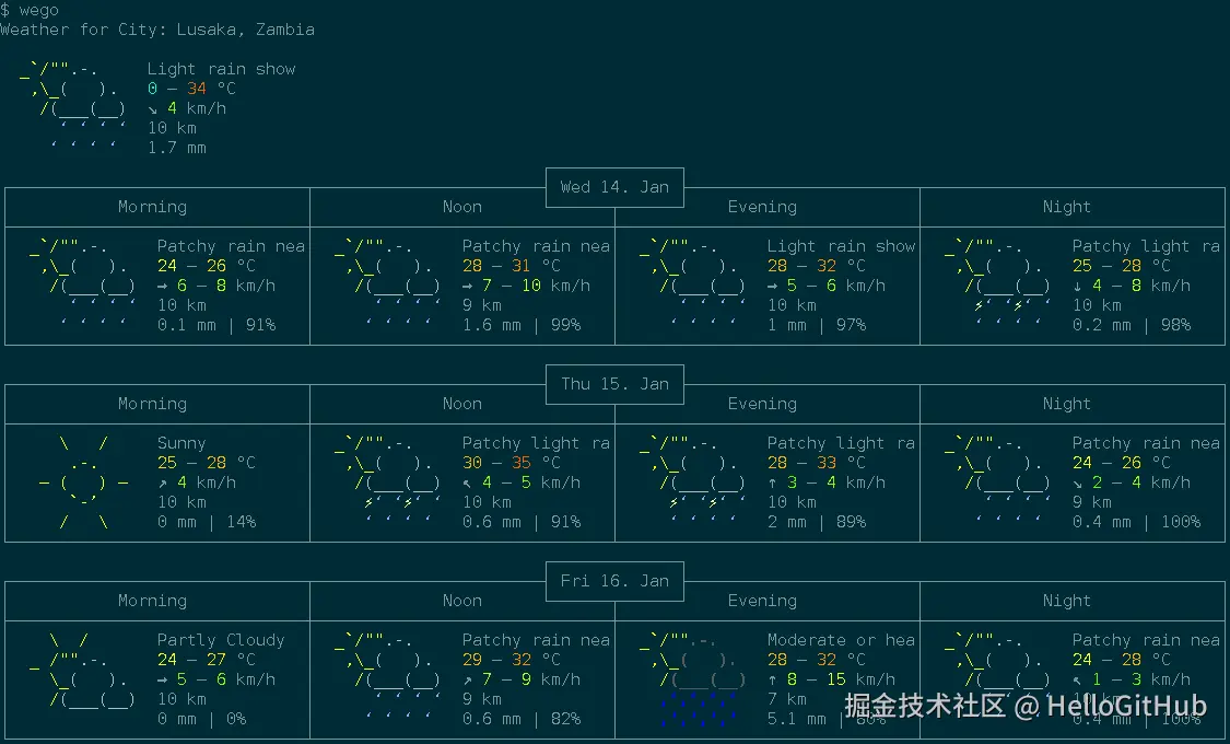 13、wego:快速查看天气预报的命令行工具。这是一款用 Go 语言开发的命令行查看天气的工具,可以帮助用户快速获取未来几天的天气信息,包括温度、风速、风向、降水量等。