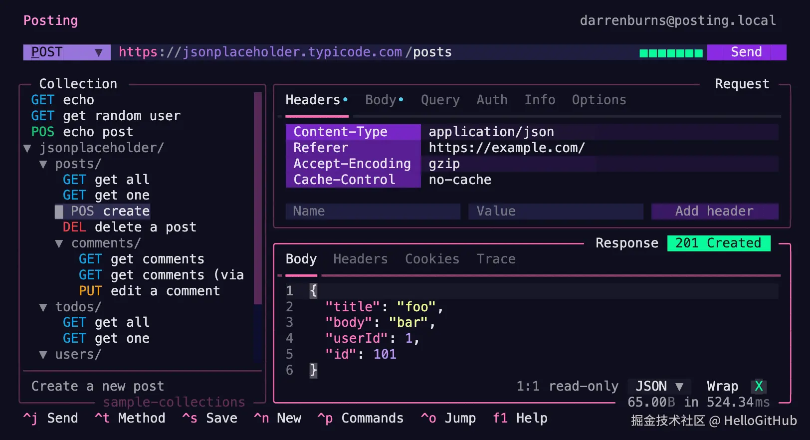 26、posting:炫酷的终端 API 调试工具。这是一款现代化的终端 HTTP 客户端,堪称 Postman 和 Insomnia 的命令行版。它为开发者提供了便捷的 TUI 使用体验,并优化了键盘操作流程,支持自动补全、语法高亮、Vim 键绑定和请求存储在本地文件(YAML)等功能。