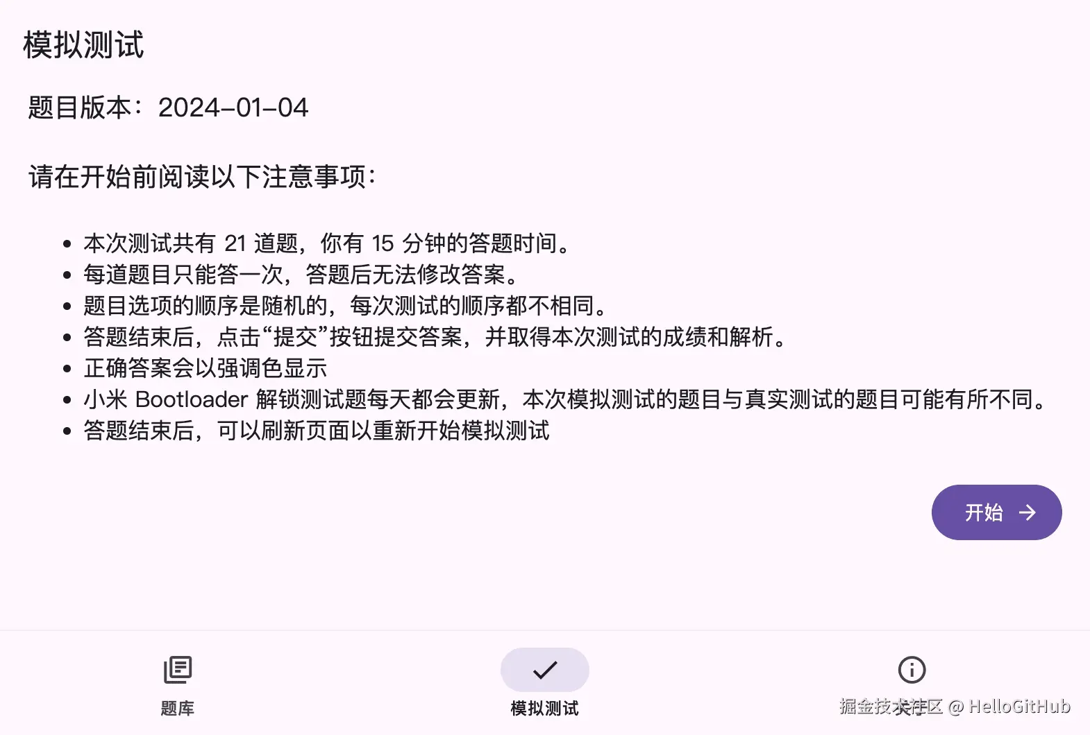 42、Xiaomi-BootLoader-Questionnaire:小米手机解锁刷机资格的答题测试。该项目是小米 BootLoader 解锁的答题库,起因是小米手机在获取 BootLoader 解锁资格前,需要先通过答题才能申请。