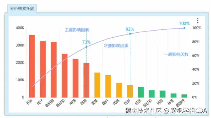 在管理和质量控制领域,帕累托分析(Pareto Analysis)是一种决策工具,用于识别少数重要因素对总体影响的程度。除此之外还可以有如下应用: