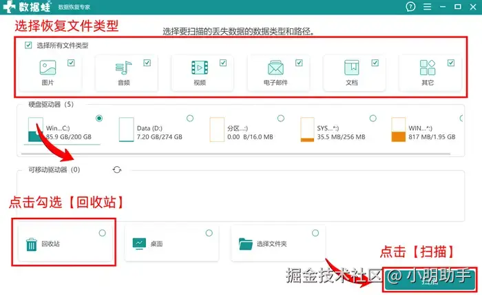 步骤1:使用数据 蛙恢复专家,在首页上选择所需文件类型和回收站,完成两项选择后才点击【扫描】;