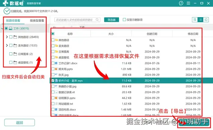 步骤2:软件扫描完成后,用户可以在左边查看文件的分类,在中间位置选择需要恢复的文件,点击选中后按下右下角的【导出】;
