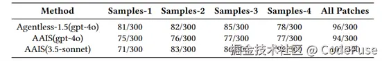 补丁筛选阶段的目的是从已产生的 44 组补丁中选择出最有可能修复问题的一个。基于前人的工作,本文使用回归测试和复现测试两种测试用例进行筛选。回归测试用例由 LLM 所有存储库中当前可通过的测试用例中选出;复现测试用例则由 LLM 根据问题描述直接生成,并过滤出在当前存储库状态下失败的用例。AAIS 的选择以最大化复现测试用例通过的数量同时最小化回归测试用例失败的数量为原则,并且当二者都不能选择时,采用多数投票法选出被生成次数最多的补丁。