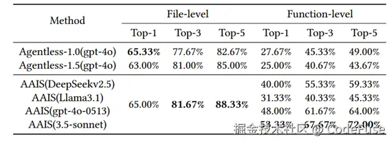 表格 1 基于低智能体的 Issue solving方法在缺陷定位上的性能对比