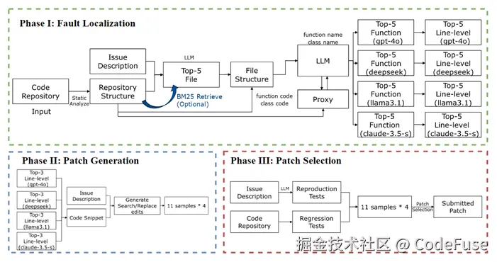 如图 1 上方所示,首先基于存储库的当前状态,通过静态分析工具格式化存储库结构,使用 BM25 检索算法,匹配与问题描述中最相似的 Top-5 代码文件;然后进一步抽取文件格式,采用 Agent 的思想使 LLM 在有限次问答中判定最有可能出错的 Top-5 函数代码/类;最后提供所获得的完整函数代码,获得所需修改的行号信息。