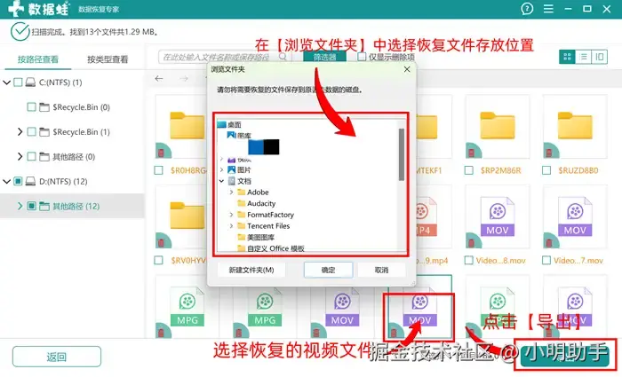 第2步:等待扫描结果出现后,选择自己需要恢复的视频,然后点击【导出】;最后在弹窗选择恢复视频文件的存放位置。