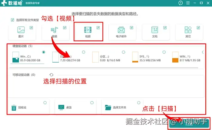 第1步:打开数据 蛙恢复专家,在软件首页上选择【视频】后,再选择需要扫描的位置,选好后点击【扫描】;