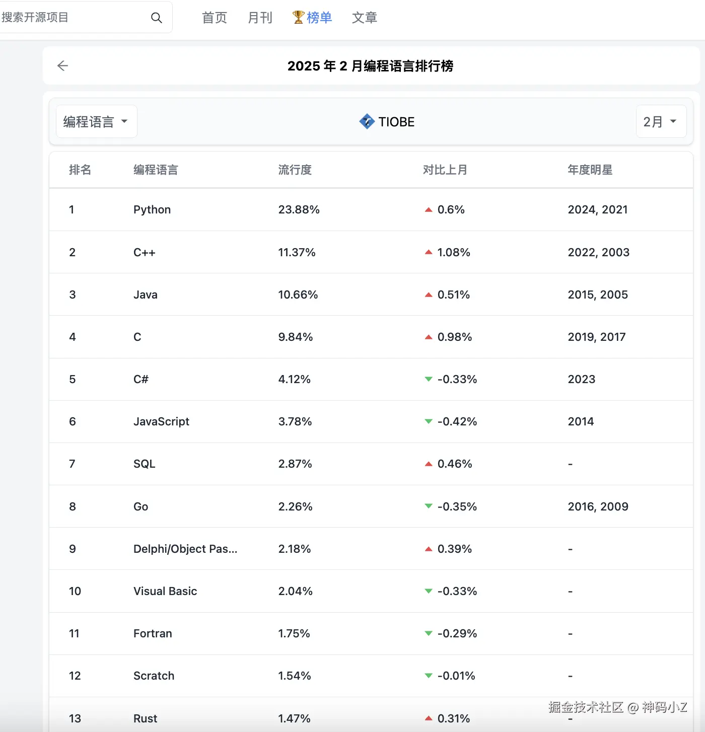 再来看下TIOBE(hellogithub.com/report/tiob…)发布的2025年最新编程语言流行度排行榜:可以看到,python已经连续两年高居榜首,特别是在今年DeepSeek引爆AI后,Python的使用程度将占比更高!而当前主流的Agent框架:LangChain和LlamaIndex这些开源工程也都是python编写,所以如果想转行做AI开发,python也是必须学习的编程语言!
