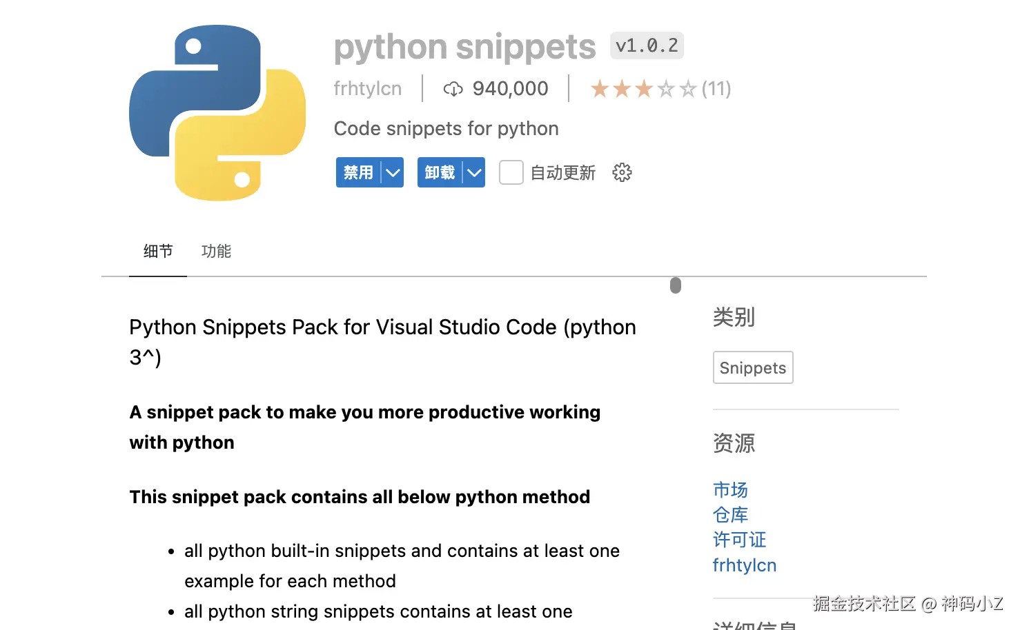 Python Snippets 插件可以让我们的 Python 编程更加高效。它包含了大量的内置方法,以及string、list、sets、tuple、dictionary、class代码片段,并且还为每个代码段提供至少一个示例。