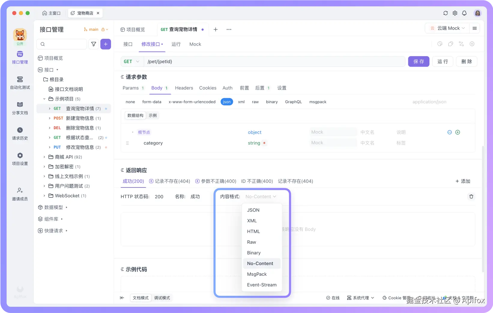 当接口实际没有返回任何响应体时,支持将内容格式配置为 No-Content,更准确地反映接口的实际行为。让接口文档更加清晰规范,提升响应校验的使用体验。