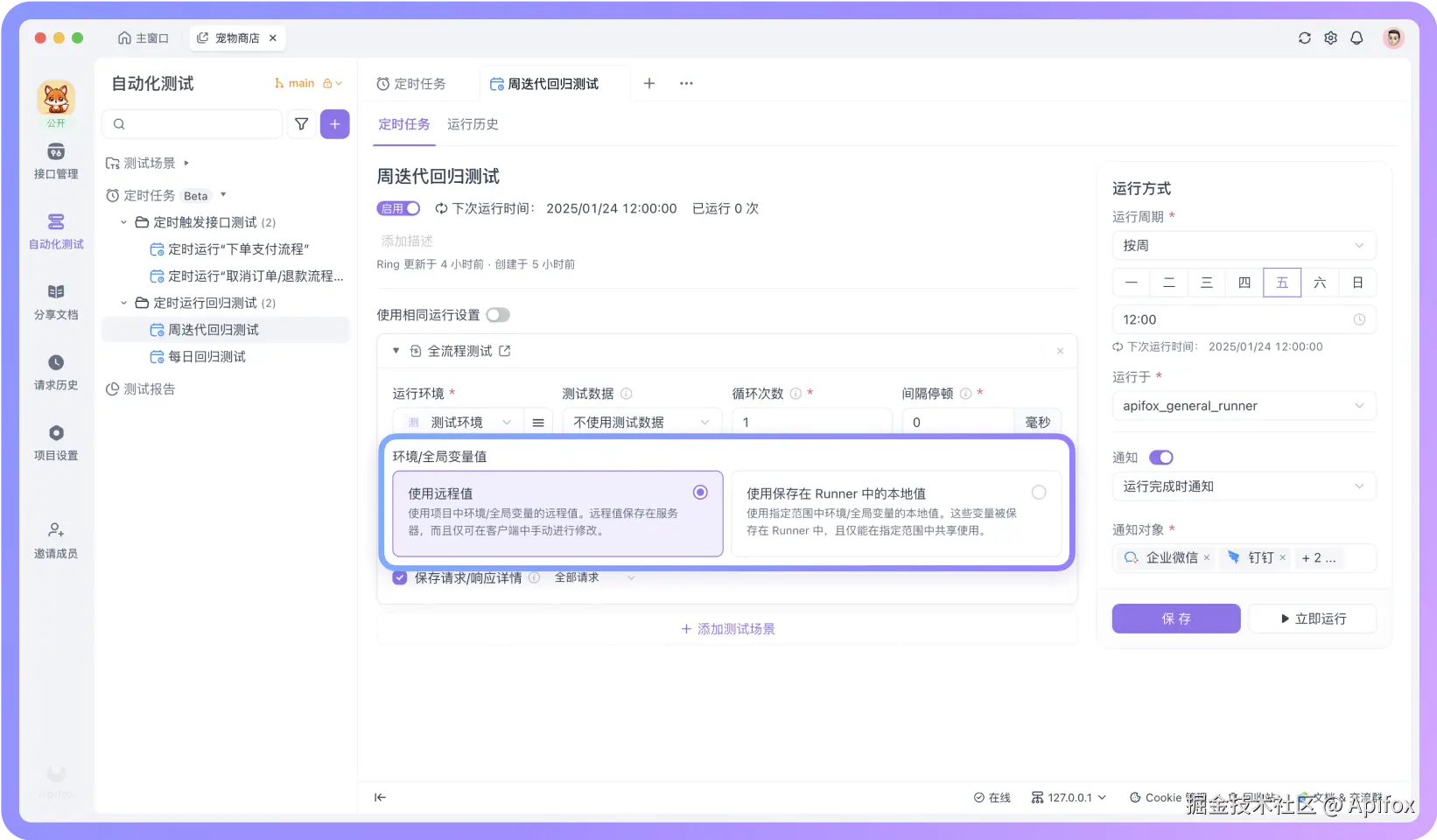 当使用定时任务在 Runner 中运行测试场景时,你可以自由选择使用环境变量和全局变量的「远程值」,或是使用保存在 Runner 中的「本地值」。让变量的使用范围更灵活,更适应不同的真实场景需求。
