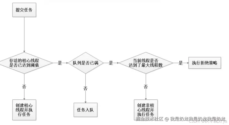3. 任务分配: 判断核心线程是否都在工作,若有空闲则直接分配任务。 若核心线程都在忙,则判断队列是否满,不满则入队等待。 若队列也满了,则判断当前线程数是否达到最大线程数,未达到则创建新线程执行任务,达 到则触发拒绝策略。