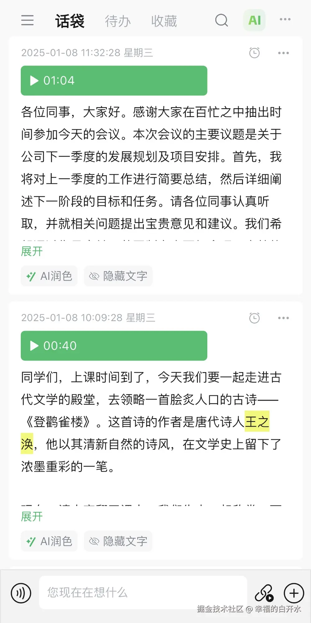 随着AI技术的不断进步,普通人不再需要是技术专家,也能利用这些智能工具提高生活质量和工作效率。从语音笔记到待办清单,从AI脑暴到AI阅读,像话袋这样的智能平台正让生活变得更加智能、便捷和高效。无论是工作中的高效管理,还是日常生活中的便捷服务,AI正逐步成为每个人生活的一部分,帮助我们更好地应对日常挑战,提升我们的生产力和创意能力。