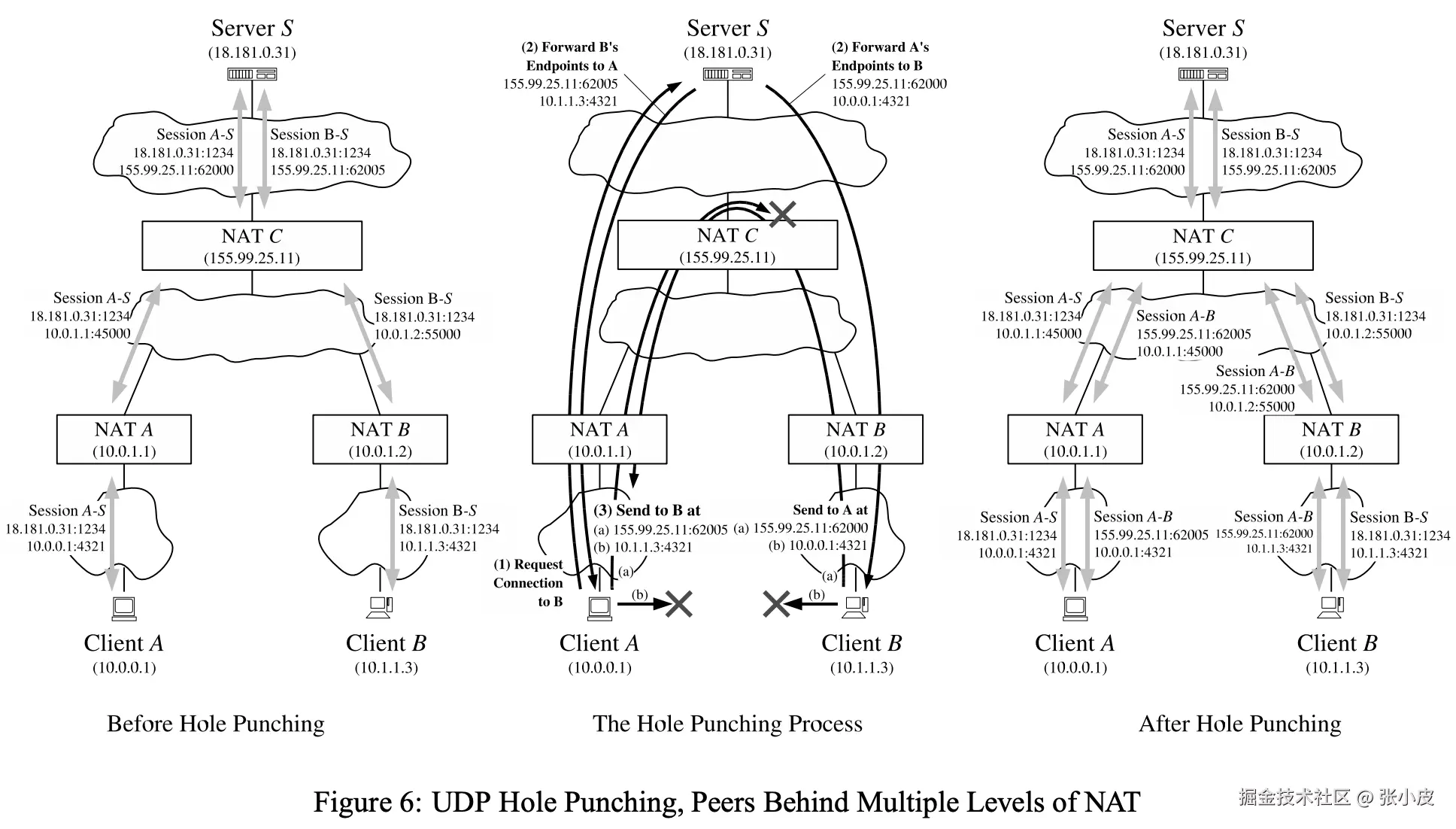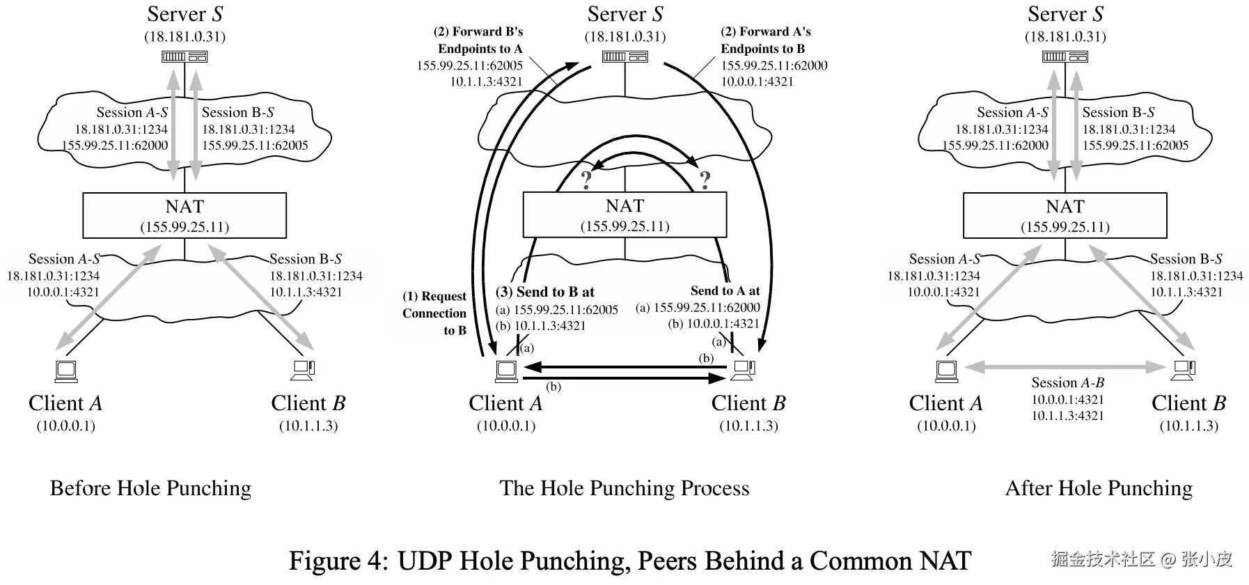 - A与B分别与S建立连接,S记录下双方的内网信息,以及自己观察到的公网信息;