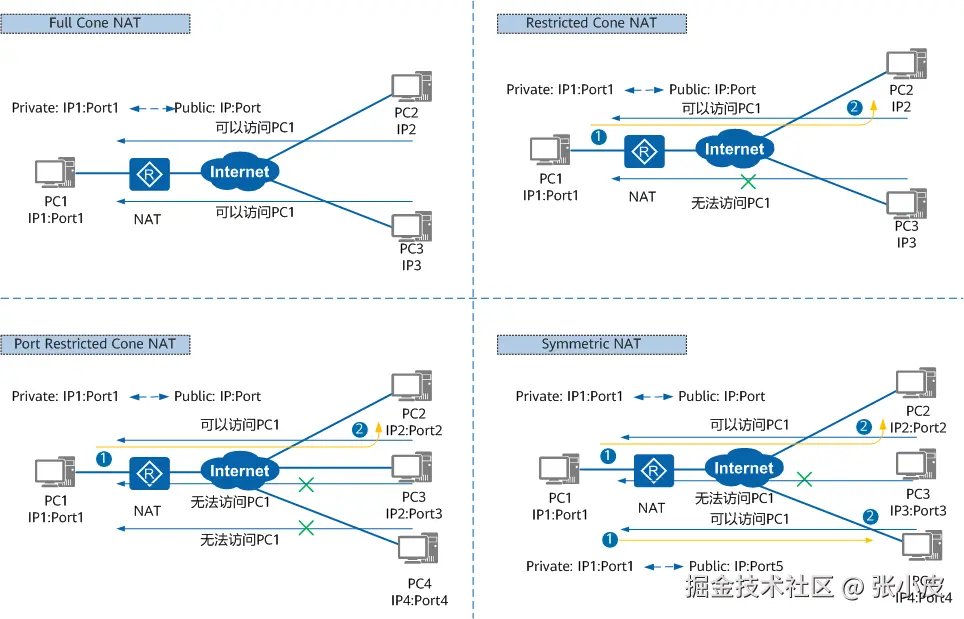 根据路由器对私网IP端口到公网IP端口的映射方式,RFC3489中将NAT分为四种类型