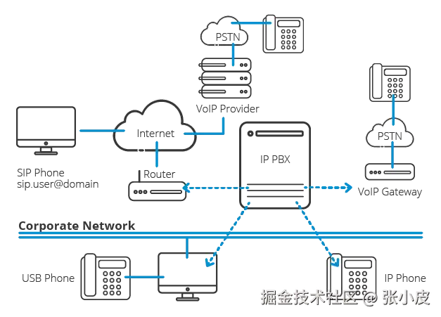 通过上述的P2P打洞技术,实现了客户端之间的数据包传输;通过SIP指令和SDP,实现了会话的管理。实际场景中,将这些技术统一构建为IP PBX服务(Private Branch Exchange)即网络电话交换机。IP PBX不仅可以通过网络连接企业内部电话,还可以通过PSTN(Public Switched Telephone Network)公共交换电话网连接传统电话。