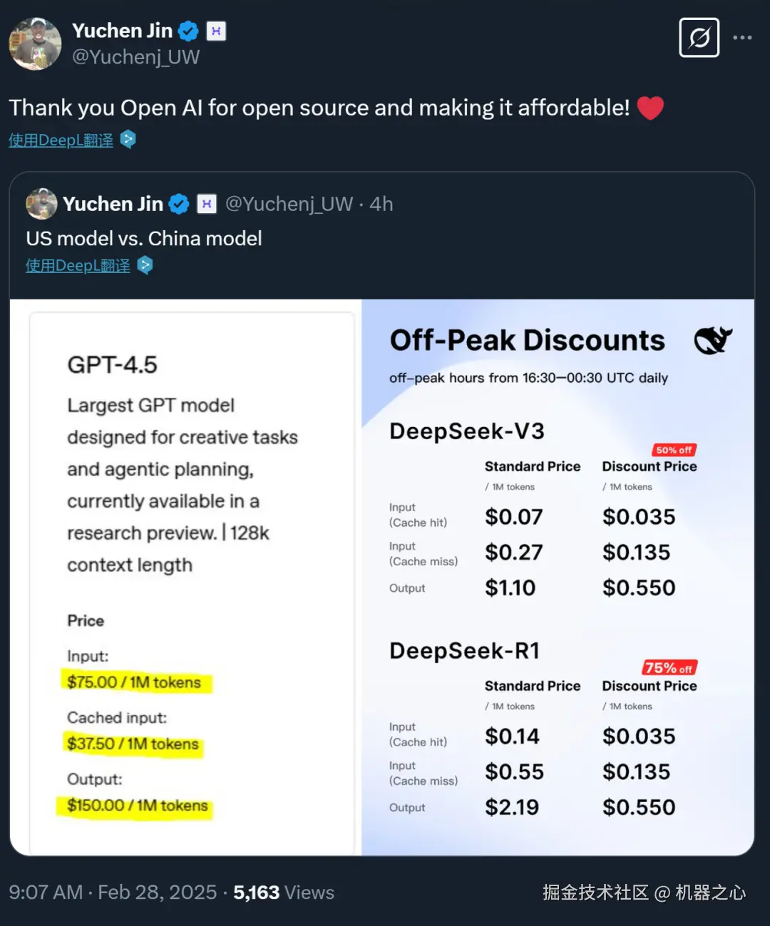 同时,OpenAI 刚刚发布的 GPT-4.5 也被拉出来对比价格: