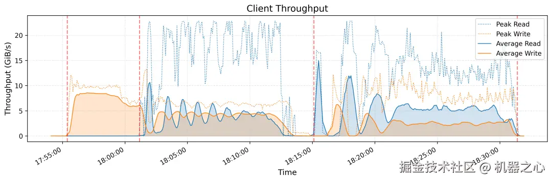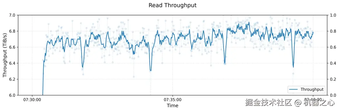 下图展示了在大型 3FS 集群上进行读取压力测试的吞吐量。该集群由 180 个存储节点组成,每个存储节点配备 2×200Gbps InfiniBand 网卡和 16 个 14TiB NVMe SSD。大约 500+ 个客户端节点用于读取压力测试 ,每个客户端节点配置 1x200Gbps InfiniBand 网卡。在有训练作业的背景流量情况下,最终聚合读取吞吐量达到约 6.6 TiB/s。