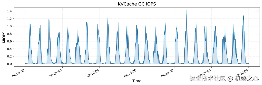 上图展示了所有 KVCache 客户端的读取吞吐量,突出显示了峰值和平均值,峰值吞吐量高达 40 GiB/s。下图展示了同一时间段内垃圾回收 (GC) 中删除操作的 IOPS。