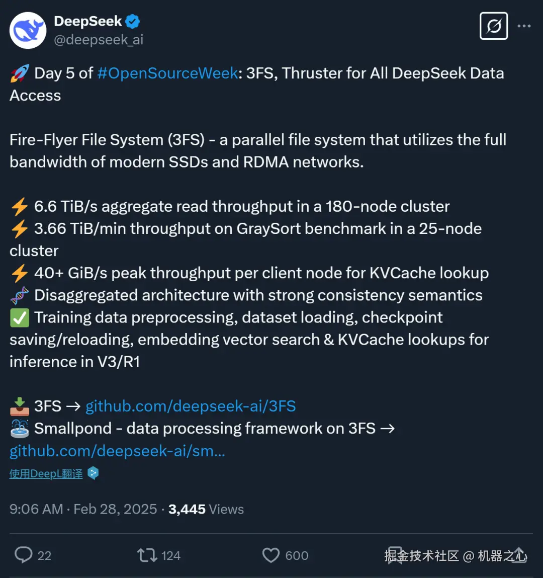 今天他们开源了一个名为 3FS(Fire-Flyer File System)的系统。这是一种并行文件系统,它利用现代固态硬盘(SSD)和远程直接内存访问(RDMA)网络的全部带宽,能够加速和推动 DeepSeek 平台上所有数据访问操作。