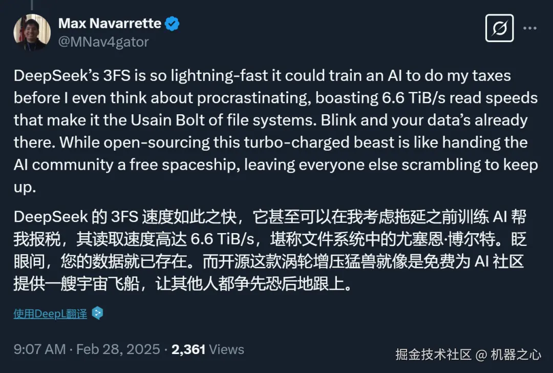 同时,这位研究者也是一位早期使用者,他评价说,「DeepSeek 的 3FS 系统快得惊人,它处理数据的速度快到可以在我还没来得及拖延的时候就已经训练好了一个能帮我报税的 AI。它拥有 6.6 TiB/s 的读取速度,这使它成为文件系统界的『博尔特』(世界最快短跑运动员)。你眨眼的功夫,数据就已经处理完毕了。而将这个超级快速的系统开源,就像是给整个 AI 社区免费赠送了一艘宇宙飞船,让其他所有竞争者都不得不加紧脚步追赶。」