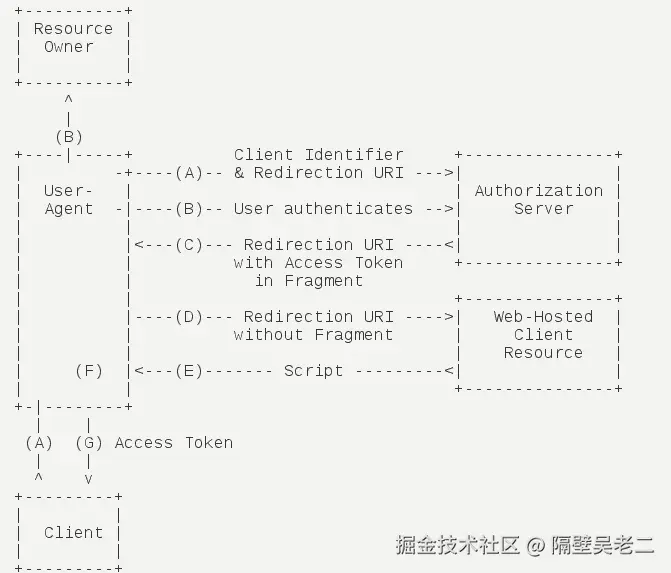 有些 Web 应用是纯前端应用,没有后端。这时就不能用上面的方式了,必须将令牌储存在前端。RFC 6749 就规定了第二种方式,允许直接向前端颁发令牌,这种方式没有授权码这个中间步骤,所以称为(授权码)"隐藏式"(implicit)