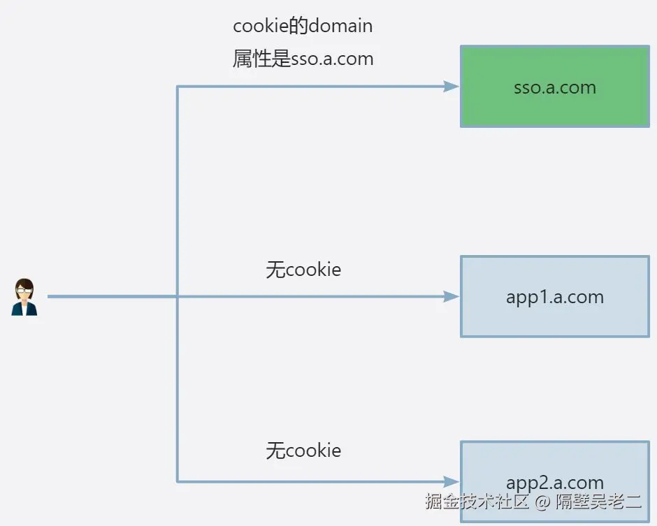 Cookie是不能跨域的,我们Cookie的domain属性是sso.a.com,在给app1.a.com和app2.a.com发送请求是带不上的。