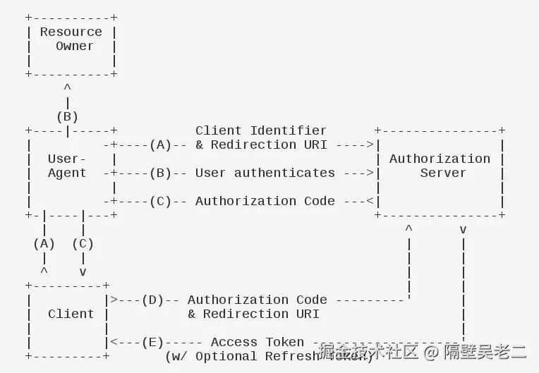 总结:用户通过授权服务器获取授权码,再用该码在后端换取访问令牌和刷新令牌。