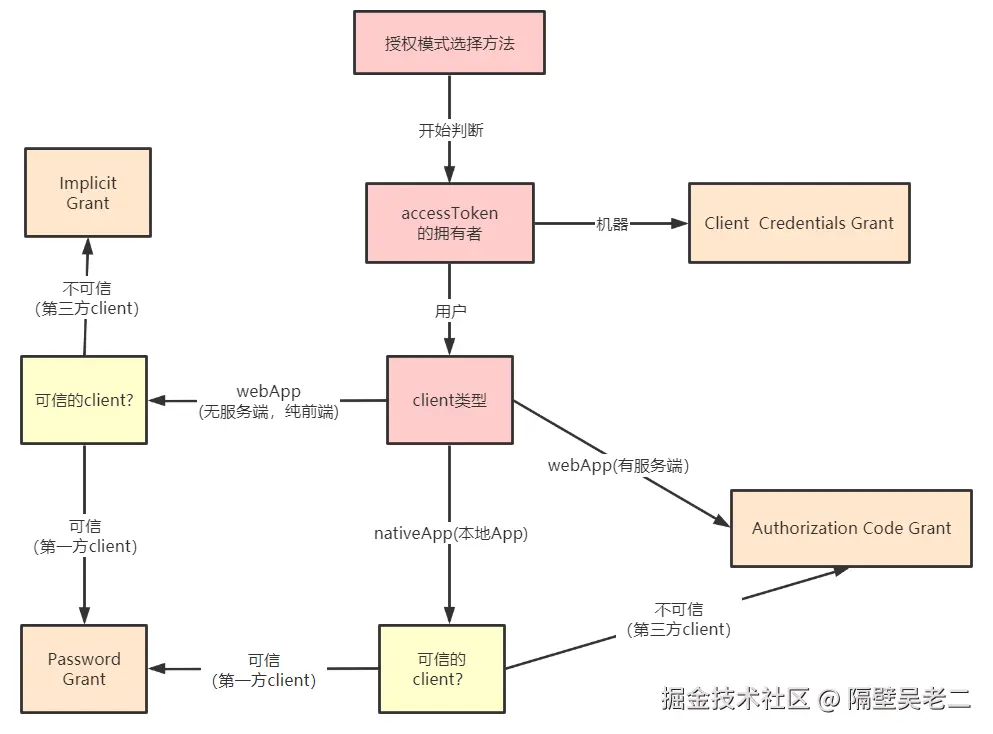 客户端必须得到用户的授权(authorization grant),才能获得令牌(access token)。OAuth 2.0 对于如何颁发令牌的细节,规定得非常详细。具体来说,一共分成四种授权类型(authorization grant),即四种颁发令牌的方式,适用于不同的互联网场景。