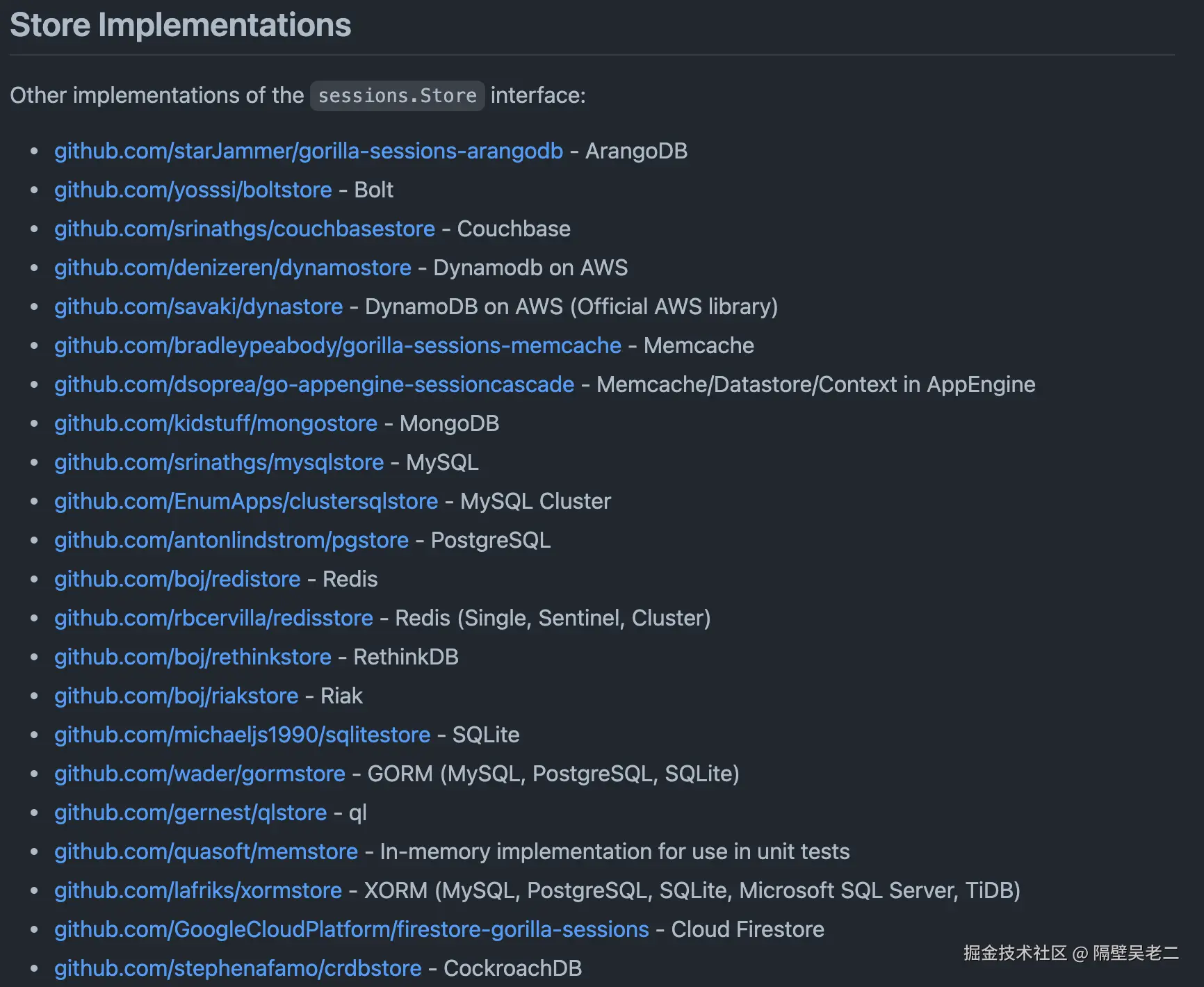 sessions提供了扩展接口,方便扩展使用其他的后端存储 session 内容。目前 GitHub 上已经有很多的第三方后端扩展了,详细 list 见sessions库的 GitHub 首页:GitHub - gorilla/sessions: Package gorilla/sessions provides cookie and filesystem sessions and infrastructure for custom session backends.