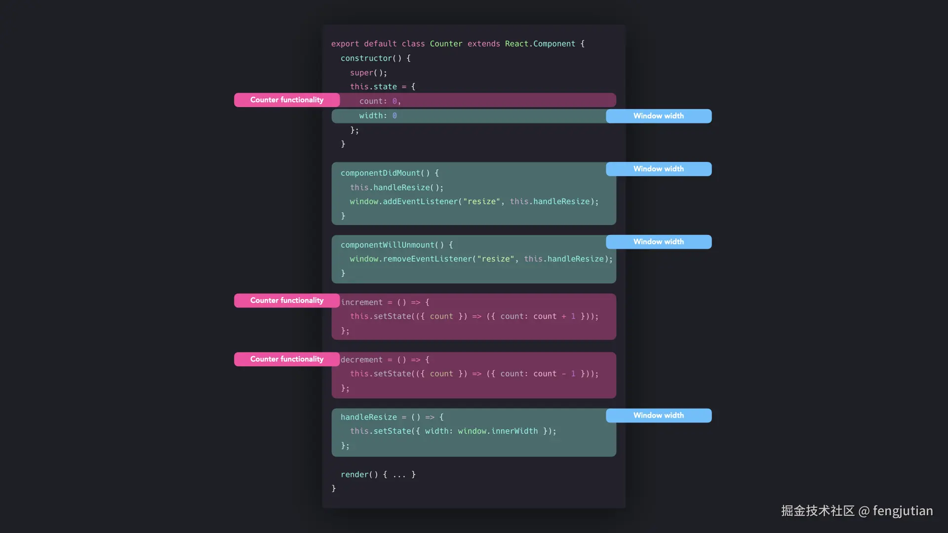 尽管这是一个小组件,但组件内的逻辑已经相当纠缠。某些部分指向 counter 逻辑,其他部分属于 width 逻辑。随着组件的增长,可能会越来越难以在组件内组织逻辑,找到相关逻辑。