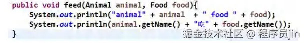 System.out.println("主人 " + name + " 给 " + animal.getName() + " 吃 " + food.getName());