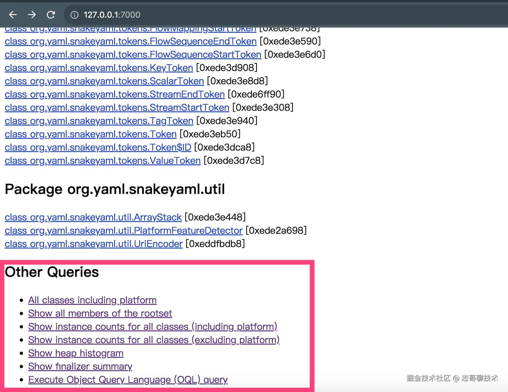翻到最底部可以查询 jhat 提供的几个查询功能,部分列表信息如下。