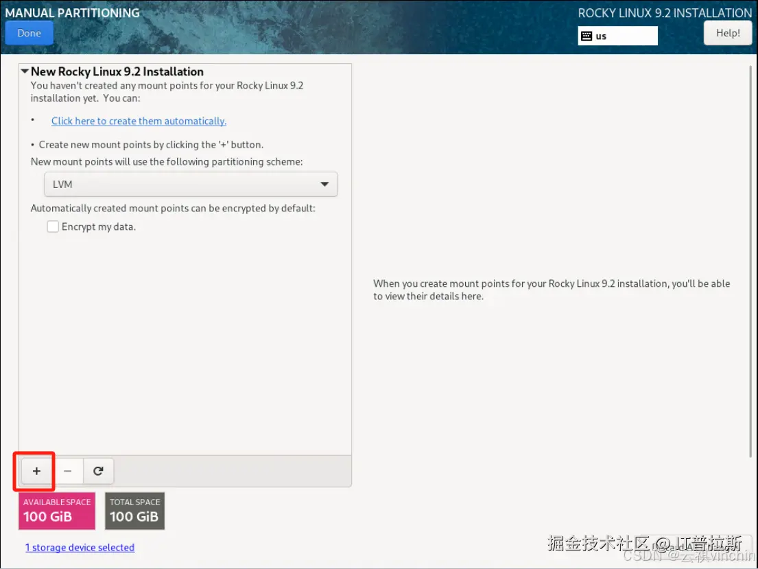 只勾选系统盘,选择“Custom”后点击【Done】进行手动分区,如图5。