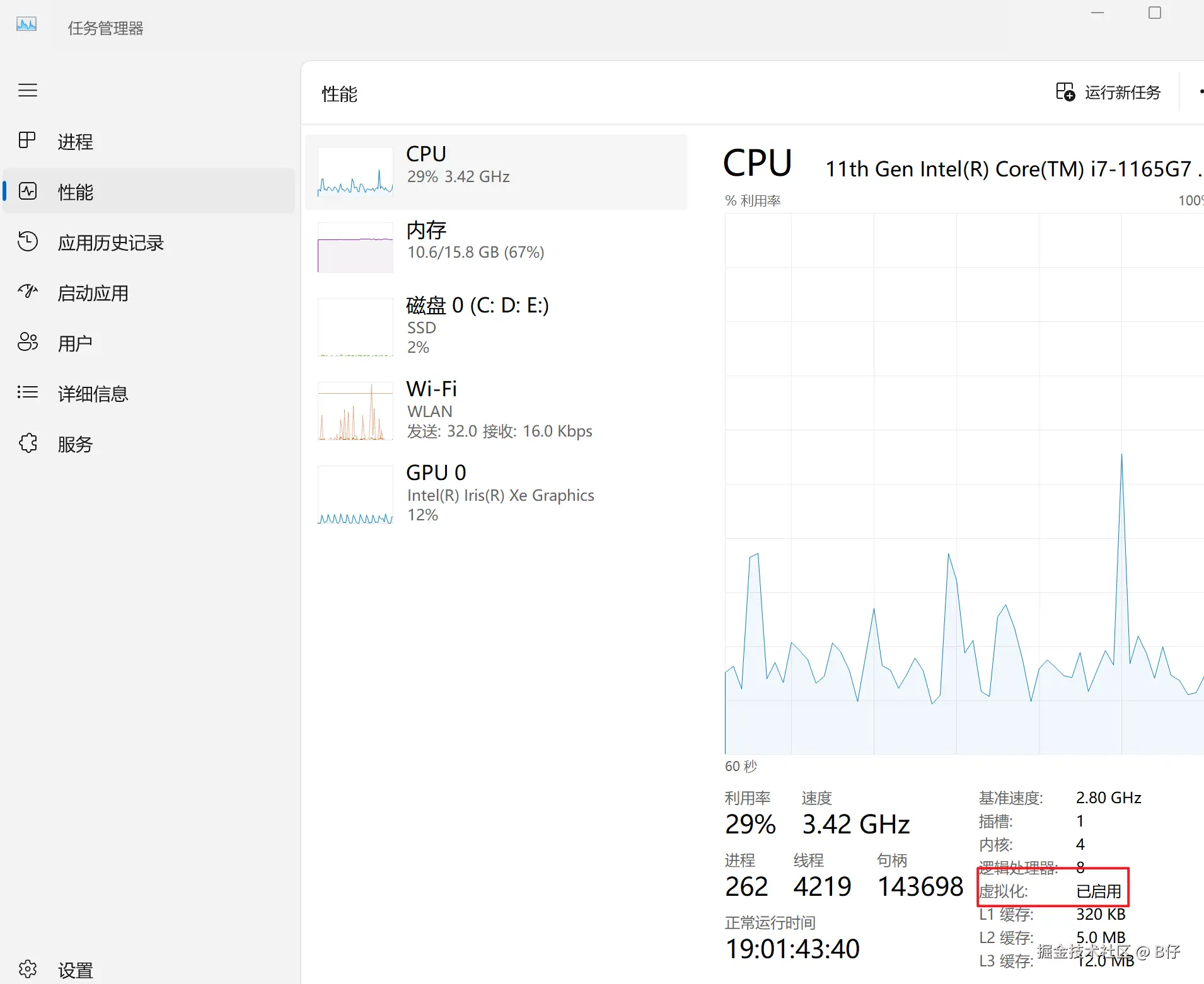 如何查看是否开启了虚拟化技术:Ctrl+Alt+Delete,打开任务管理器,点击性能