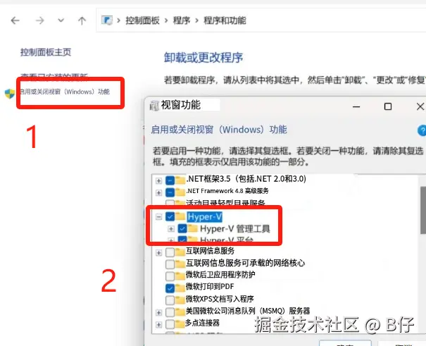 - Windows 功能:需要在 “Windows 功能” 中勾选 Hyper-V。