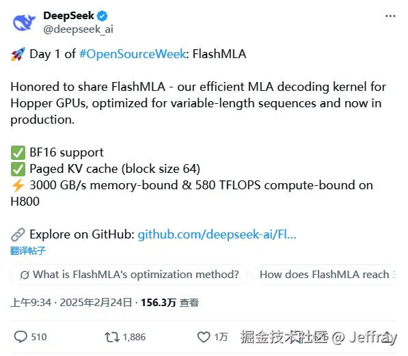 2月24日,开源周的首日,DeepSeek发布了FlashMLA(Flash Matrix Library for AI)。该库旨在提升AI模型在有限资源GPU上的运行效率,特别是针对H800等算力相对有限的设备。FlashMLA通过优化矩阵运算,加速模型训练和推理过程,使开发者能够在成本更低的硬件上实现高性能AI应用。