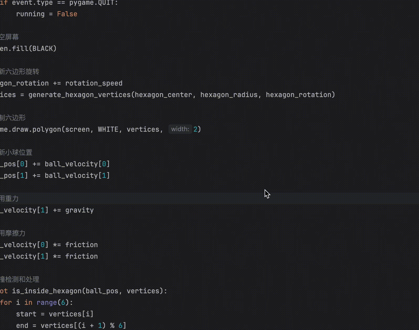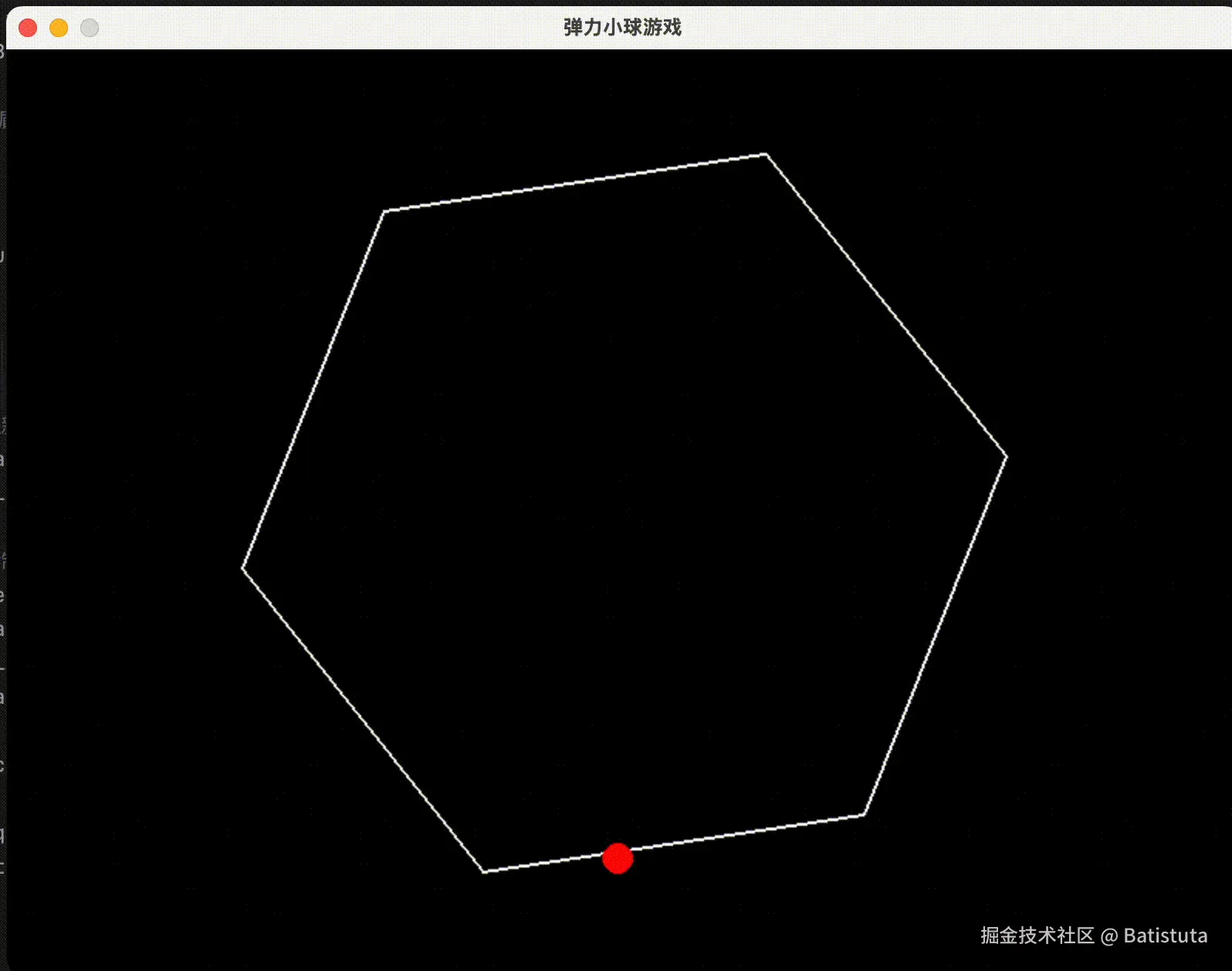 - 碰撞检测:小球与六边形墙壁碰撞时,需要按照物理规律反弹。