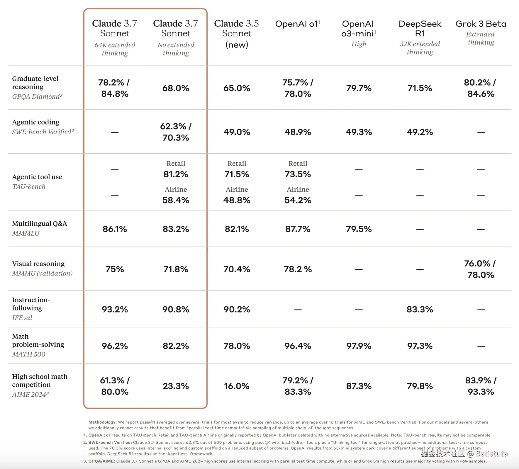 Claude3.7:表现确实可圈可点,口碑也一直在线,在闭源AI里面,算比较靠谱的存在,对比Claude3.5也有较大的提升