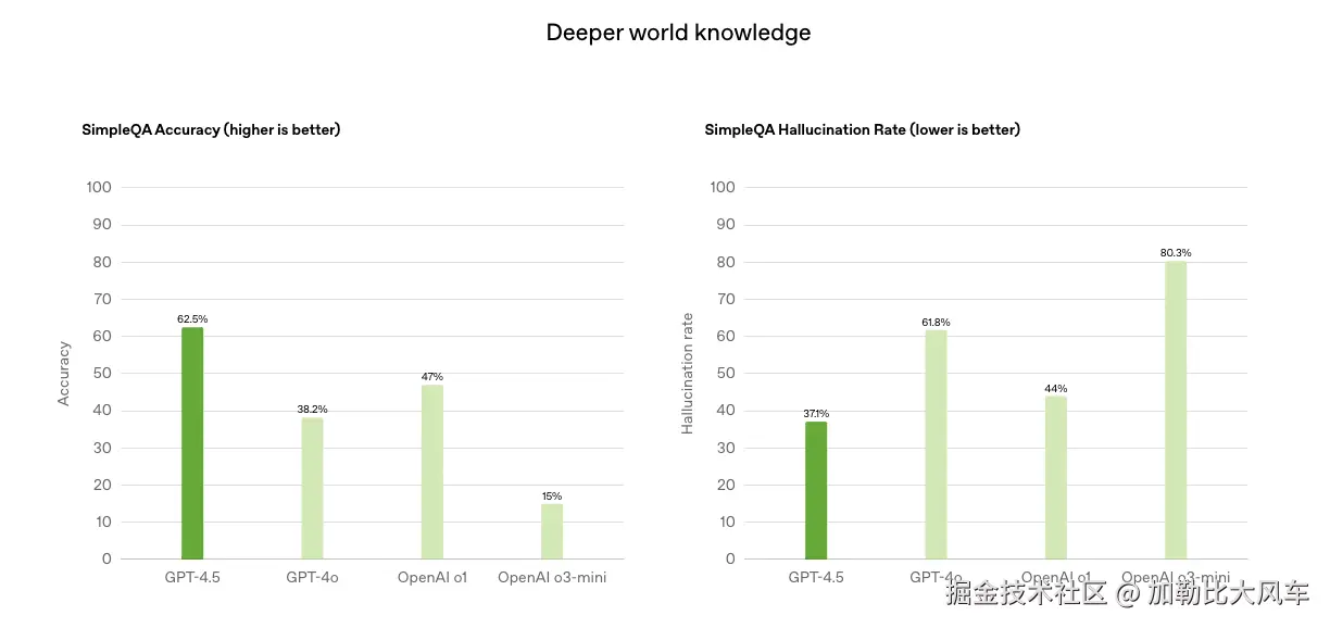 更深入的世界知识: GPT-4.5 在 SimpleQA 基准测试中表现出色,表明其拥有更广泛的知识,对世界的理解更深入,从而减少了幻觉,并在各种主题上具有更高的可靠性。